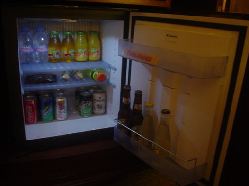 冷蔵庫です。このように飲み物等ですでに入っているので、自分で買ってきた食料品を入れるスペースはあまりありませんでした。
