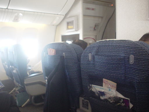 今回乗った機種はボーイング777−200で、プレミアムクラスの座席配置は2列−3列−2列でした。