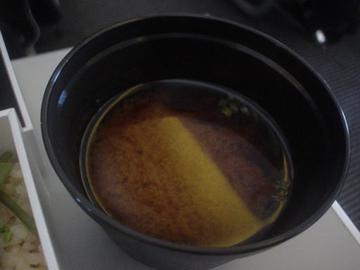 お味噌汁です。もちろんインスタントですが、どういうわけか、空で飲む味噌汁は、地上で飲む味噌汁より美味しく感じてしまいます。