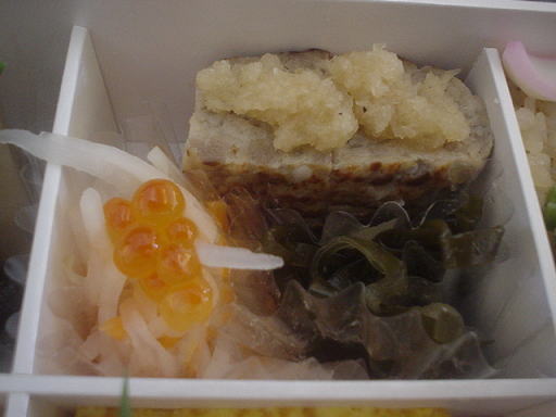 ハンバーグ、クーブイリチー、イクラが添えられた生酢です。