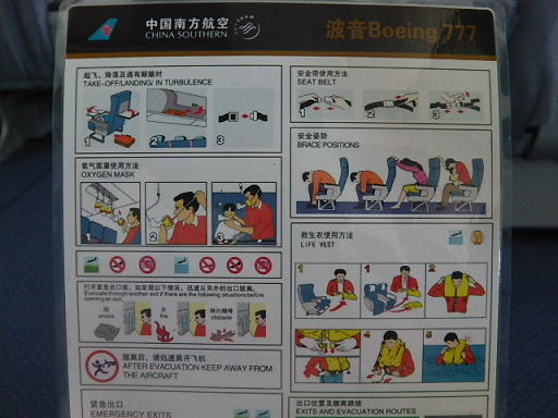 安全のしおりです。機種はボーイングの777−200でした。シーズンによっては、成田〜広州線または関空〜広州線でも使用されることがあります。