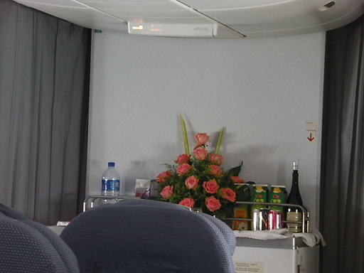 機内食の時間になると、演出の1つなのでしょうか、前方に花束とドリンク類が置かれました。ちなみに、着陸態勢になると、これらは片づけられました。