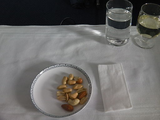 まず、飲み物とおつまみです。おつまみはピーナッツで、一応お皿に盛られましたが、ちょっと寂しい感じです。飲み物には水と白ワインをいただきました。