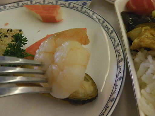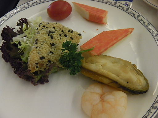 前菜は、ムール貝、海老、カニカマ等です。ビジネスクラスの前菜でカニカマにはがっかりです(笑)。