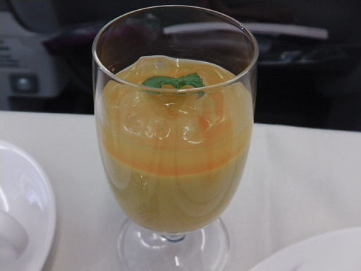 まずは前菜です。メインディッシュの前に、前菜だけが出されました。ビジネスクラスに乗っていることを実感できる一瞬です。
