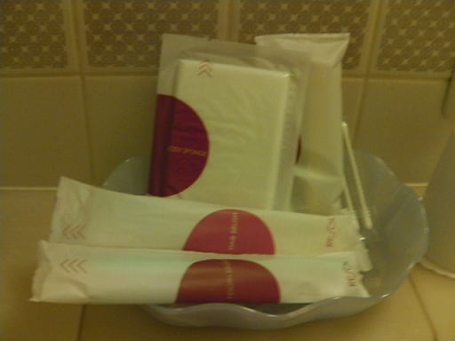 アメニティ類です。歯ブラシ、綿棒、ボディスポンジなどがありました。