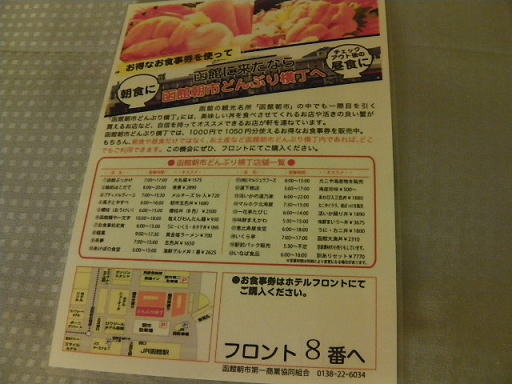 函館駅前のホテルらしく、函館朝市どんぶり横町の食事券の案内でした。1,000円で1,050円分の食事券がフロントで購入できるようです。