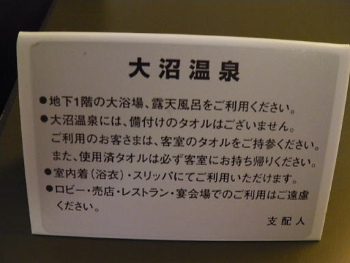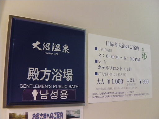 地下1階の大沼温泉に着きました。日帰り入浴の案内もあり、時間帯は14〜18時で、料金は、貸しタオル代を含めて大人は1,000円、小学生以下の子供は500円でした。