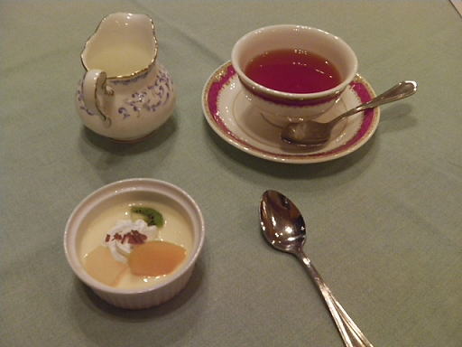 デザートです。飲み物はコーヒーまたは紅茶から選べます。デザートはムース系でした。せめてソーサーのような皿の上に、ムースを置いてほしかったです。なんか素っ気ない置き方でした。