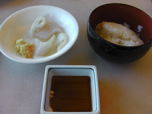 イカ刺しとごはんです。イカ刺しは特別新鮮ということでもなく、普通でした。