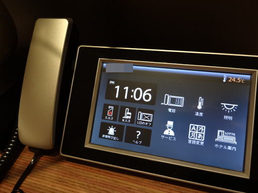 ベッドの横には、このようなモニターがありました。このモニターで電話ができるほか、ライトや温度の調整などもできました。受話器をとると電話のプッシュ画面になります。