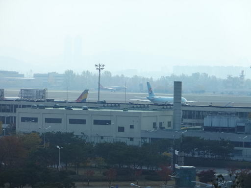 翌日の朝、部屋の窓から外を見てみると、遠くに金浦空港の滑走路が見えました。ちょうど大韓航空機とアシアナ航空機がありました。