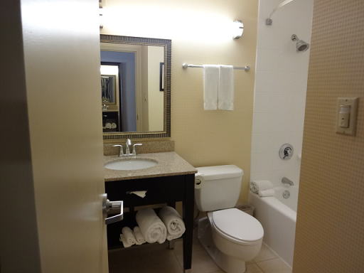 浴室です。典型的なアメリカにあるバスルームといった感じです。アメリカなので、もちろんトイレはウォッシュレットではありません。
